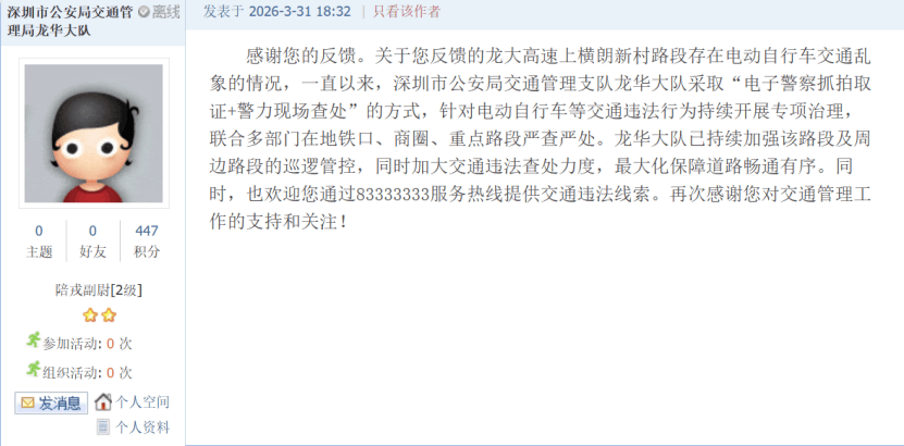 据了解,此前,深圳市公安局交通管理支队龙华大队已在官方回复中明确表态,针对福龙路上横朗新村路段的电动自行车交通乱象,交警部门一直采取“电子警察抓拍取证+警力现场查处”的方式,持续开展专项治理。